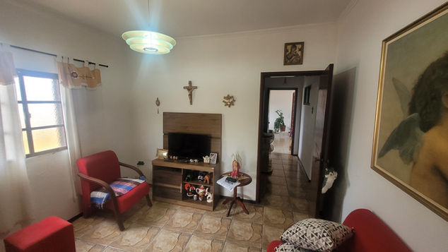 Casa com 4 quartos, sala, copa, cozinha, 2 banheiros, quintal, área de serviço e garagem para 2 carros.